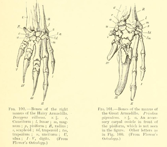 The nine-banded armadillo or the nine-banded, long-nosed armadillo is a medium-sized mammal found in North, Central and South America, making it the most widespread of the armadillos. Its ancestors originated in South America and remained there until the formation of the Isthmus of Panama allowed them to enter North America as part of the Great American Interchange, an important late Cenozoic paleozoogeographic event in which land and freshwater fauna migrated from North America via Central America to South America and vice versa, as the volcanic Isthmus of Panama rose up from the sea floor and bridged the formerly separated continents. The nine-banded armadillo is a solitary, mainly nocturnal animal, found in many kinds of habitats — from mature and secondary rainforests to grassland and dry scrub. It is an insectivore, feeding chiefly on ants, termites and other small invertebrates. The armadillo can jump 3–4 feet straight in the air if sufficiently frightened, making it a particular danger on roads. It is the state small mammal of Texas.