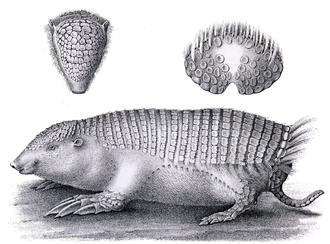 The Chacoan naked-tailed armadillo is a species of South American armadillo. It is the smallest of the naked-tail armadillos, having an average head-body length of 12 inches, while the other species range from 13 to 18 inches. They also have smaller ears than the other species, and their ears also have a distinctive fleshy expansion on the forward edge that other species lack.