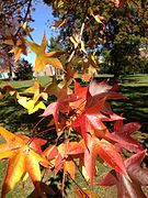 They are long and broad, with a 2 1⁄4–4 inch petiole. The rich dark green, smooth, shiny, star-shaped leaves generally turn brilliant yellow, orange, red and purple colors in the autumn. This autumnal coloring has been characterized as not simply a flame, but a conflagration. Its reds and yellows compare to that of the maples, and in addition it has the dark purples and smoky