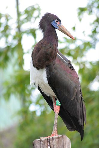 A white stork's droppings, containing faeces and uric acid, are sometimes directed onto its own legs, making them appear white. The resulting evaporation provides cooling and is termed urohidrosis. Birds that have been ringed can sometimes be affected by the accumulation of droppings around the ring leading to constriction and leg trauma. The white stork has also been noted for tool use by squeezing moss in the beak to drip water into the mouths of its chicks.