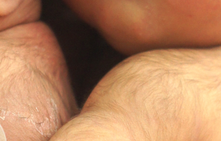 Some newborns have a fine, downy body hair called lanugo. It may be particularly noticeable on the back, shoulders, forehead, ears and face of premature infants. Lanugo disappears within a few weeks. Infants may be born with full heads of hair; others — particularly Caucasian infants — may have very fine hair or may even be bald. Among fair-skinned parents, this fine hair may be blonde, even if the parents are not. Infants’ hair color and texture change. Red can give way to blond. Curly can go straight, and baby's thick, dark hair could make its reappearance a lot sparser and lighter. The scalp may also be temporarily bruised or swollen — especially in hairless newborns, and the area around the eyes may be puffy.