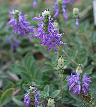 Coleus neochilus — synonym Plectranthus neochilus — which is colloquially known as lobster bush, fly bush or mosquito bush, is a perennial ground cover with highly fragrant, partially scalloped, ovate leaves and purple blue inflorescent spikes.