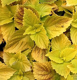 Coleus are cultivated as ornamental plants, particularly Coleus scutellarioides — syns. Coleus blumei, Plectranthus scutellarioides — which is popular as a garden plant for its brightly colored foliage. This plant prefers bright, but indirect sunlight. If direct sunlight touches the plant's leaves, the colors become less brightly colored. Outside this plant needs total shade or only the most mild morning sunlight.